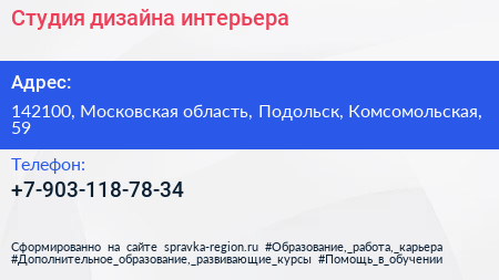 Студия дизайна интерьера по адресу 142100, Московская область, Подольск, Комсомольская, 59 в дальнейшем Организация, размещена в следующих категориях: