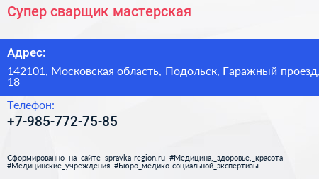 Супер сварщик, мастерская по адресу 142101, Московская область, Подольск, Гаражный проезд, 18 в дальнейшем Организация, размещена в следующих категориях:
