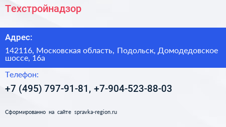 Техстройнадзор по адресу 142116, Московская область, Подольск, Домодедовское шоссе, 16а в дальнейшем Организация, размещена в следующих категориях: