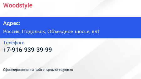 Woodstyle по адресу 1, Объездной тупик, посёлок Государственного Племенного Завода "Константиново", городской округ Домодедово, Московская область, Центральный федеральный округ, 142032, Россия в дальнейшем Организация, размещена в следующих категориях: