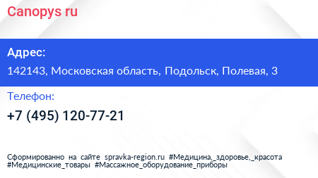 Canopys.ru по адресу 142143, Московская область, Подольск, Полевая, 3 в дальнейшем Организация, размещена в следующих категориях: