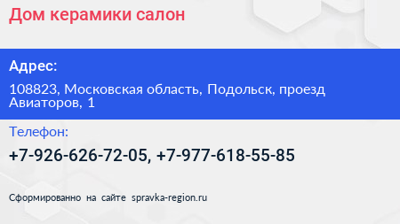 Дом керамики, салон по адресу 108823, Московская область, Подольск, проезд Авиаторов, 1 в дальнейшем Организация, размещена в следующих категориях: