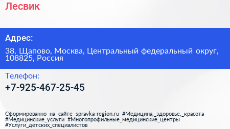 Лесвик по адресу 38, Щапово, Москва, Центральный федеральный округ, 108825, Россия в дальнейшем Организация, размещена в следующих категориях: