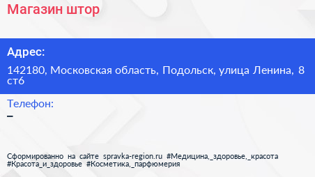 Магазин штор по адресу 142180, Московская область, Подольск, улица Ленина, 8 ст6 в дальнейшем Организация, размещена в следующих категориях: