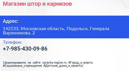 Магазин штор и карнизов по адресу 142133, Московская область, Подольск, Генерала Варенникова, 2 в дальнейшем Организация, размещена в следующих категориях: