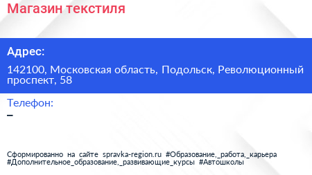 Магазин текстиля по адресу 142100, Московская область, Подольск, Революционный проспект, 58 в дальнейшем Организация, размещена в следующих категориях: