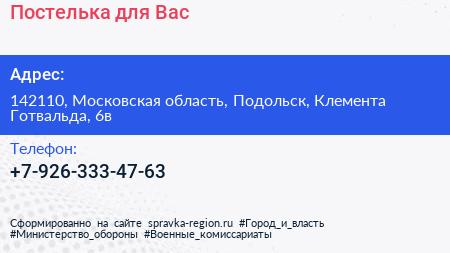 Постелька для Вас по адресу 142110, Московская область, Подольск, Клемента Готвальда, 6в в дальнейшем Организация, размещена в следующих категориях: