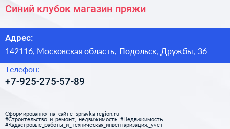 Синий клубок, магазин пряжи по адресу 142116, Московская область, Подольск, Дружбы, 36 в дальнейшем Организация, размещена в следующих категориях: