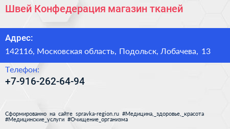 Швей Конфедерация, магазин тканей по адресу 142116, Московская область, Подольск, Лобачева, 13 в дальнейшем Организация, размещена в следующих категориях: