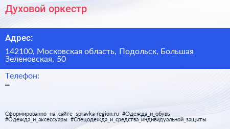 Духовой оркестр по адресу 142100, Московская область, Подольск, Большая Зеленовская, 50 в дальнейшем Организация, размещена в следующих категориях: