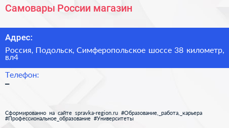 Самовары России, магазин по адресу ТЦ «Хамелеон», вл4, Симферопольское шоссе (дублёр), Александровка, городской округ Подольск, Московская область, Центральный федеральный округ, 142116, Россия в дальнейшем Организация, размещена в следующих категориях: