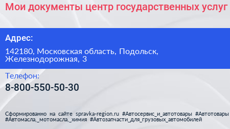 Мои документы, центр государственных услуг по адресу 142180, Московская область, Подольск, Железнодорожная, 3 в дальнейшем Организация, размещена в следующих категориях: