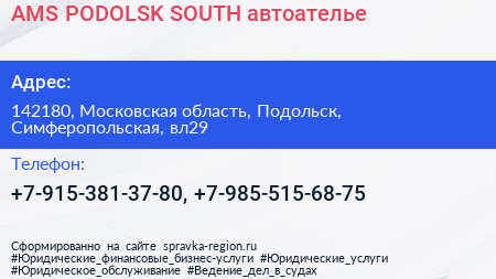 AMS PODOLSK-SOUTH, автоателье по адресу 142180, Московская область, Подольск, Симферопольская, вл29 в дальнейшем Организация, размещена в следующих категориях: