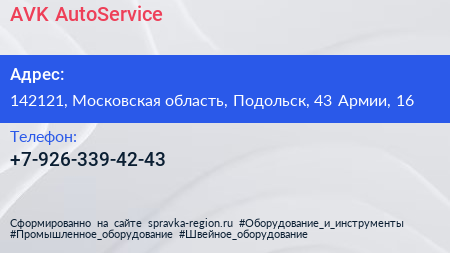 AVK AutoService по адресу 142121, Московская область, Подольск, 43 Армии, 16 в дальнейшем Организация, размещена в следующих категориях: