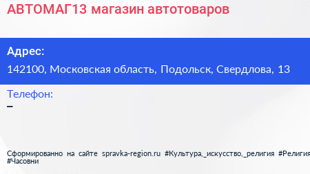 АВТОМАГ13, магазин автотоваров по адресу 142100, Московская область, Подольск, Свердлова, 13 в дальнейшем Организация, размещена в следующих категориях: