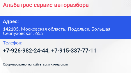Альбатрос, сервис авторазбора по адресу 142105, Московская область, Подольск, Большая Серпуховская, 65а в дальнейшем Организация, размещена в следующих категориях: