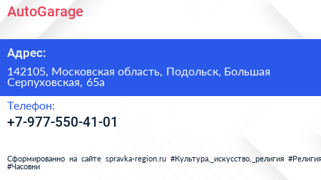 AutoGarage по адресу 142105, Московская область, Подольск, Большая Серпуховская, 65а в дальнейшем Организация, размещена в следующих категориях: