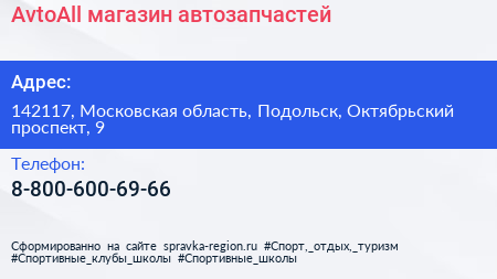 AvtoAll, магазин автозапчастей по адресу 142117, Московская область, Подольск, Октябрьский проспект, 9 в дальнейшем Организация, размещена в следующих категориях: