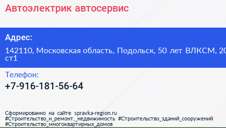 Автоэлектрик, автосервис по адресу 142110, Московская область, Подольск, 50 лет ВЛКСМ, 20 ст1 в дальнейшем Организация, размещена в следующих категориях: