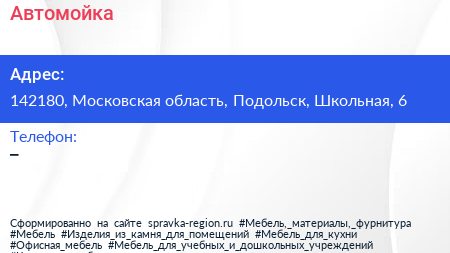 Автомойка по адресу 142180, Московская область, Подольск, Школьная, 6 в дальнейшем Организация, размещена в следующих категориях: