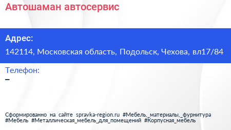 Автошаман, автосервис по адресу 142114, Московская область, Подольск, Чехова, вл17/84 в дальнейшем Организация, размещена в следующих категориях: