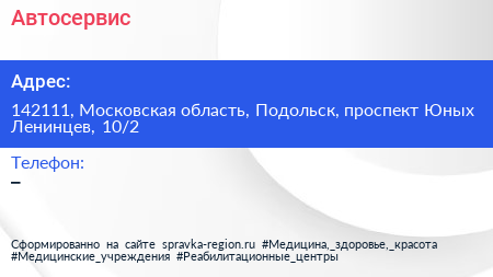 Автосервис по адресу 142111, Московская область, Подольск, проспект Юных Ленинцев, 10/2 в дальнейшем Организация, размещена в следующих категориях: