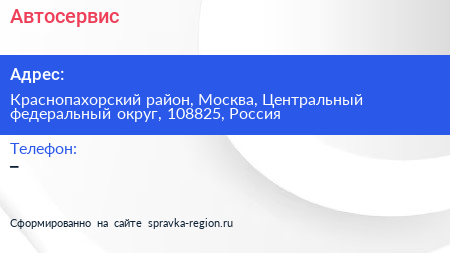 Автосервис по адресу Краснопахорский район, Москва, Центральный федеральный округ, 108825, Россия в дальнейшем Организация, размещена в следующих категориях: