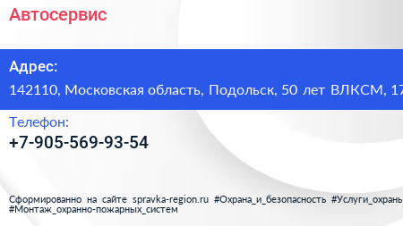 Автосервис по адресу 142110, Московская область, Подольск, 50 лет ВЛКСМ, 17 в дальнейшем Организация, размещена в следующих категориях: