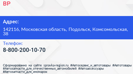 BP по адресу 142116, Московская область, Подольск, Комсомольская, 38 в дальнейшем Организация, размещена в следующих категориях: