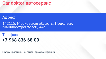 Car-doktor, автосервис по адресу 142115, Московская область, Подольск, Машиностроителей, 44е в дальнейшем Организация, размещена в следующих категориях: