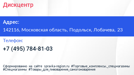 Дискцентр по адресу 142116, Московская область, Подольск, Лобачева, 23 в дальнейшем Организация, размещена в следующих категориях: