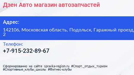 Дзен Авто, магазин автозапчастей по адресу 142106, Московская область, Подольск, Гаражный проезд, 2 в дальнейшем Организация, размещена в следующих категориях: