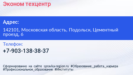 Эконом, техцентр по адресу 142101, Московская область, Подольск, Цементный проезд, 6 в дальнейшем Организация, размещена в следующих категориях: