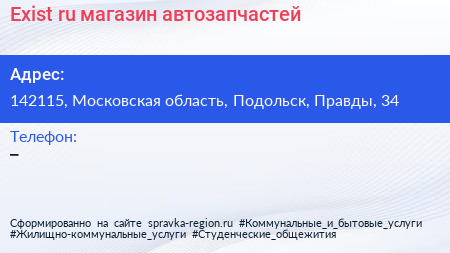 Exist.ru, магазин автозапчастей по адресу 142115, Московская область, Подольск, Правды, 34 в дальнейшем Организация, размещена в следующих категориях: