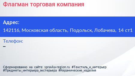 Флагман, торговая компания по адресу 142116, Московская область, Подольск, Лобачева, 14 ст1 в дальнейшем Организация, размещена в следующих категориях:
