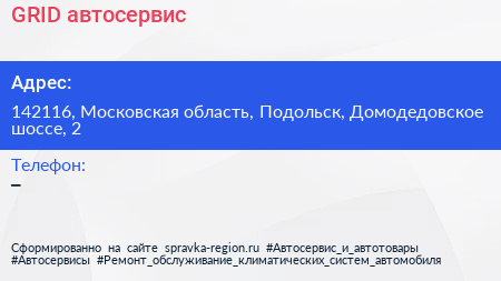 GRID, автосервис по адресу 142116, Московская область, Подольск, Домодедовское шоссе, 2 в дальнейшем Организация, размещена в следующих категориях: