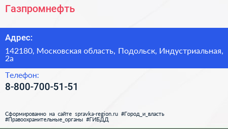 Газпромнефть по адресу 142180, Московская область, Подольск, Индустриальная, 2а в дальнейшем Организация, размещена в следующих категориях: