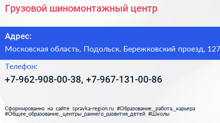 Грузовой шиномонтажный центр по адресу Московская область, Подольск, Бережковский проезд, 127 в дальнейшем Организация, размещена в следующих категориях: