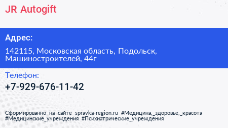 JR Autogift по адресу 142115, Московская область, Подольск, Машиностроителей, 44г в дальнейшем Организация, размещена в следующих категориях: