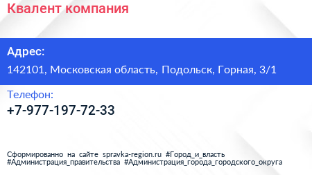 Квалент, компания по адресу 142101, Московская область, Подольск, Горная, 3/1 в дальнейшем Организация, размещена в следующих категориях: