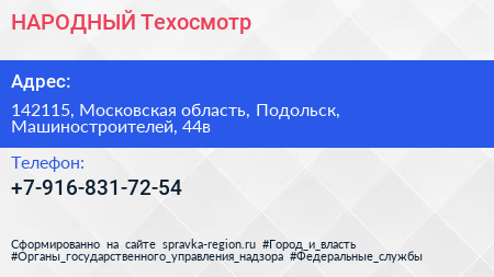 НАРОДНЫЙ Техосмотр по адресу 142115, Московская область, Подольск, Машиностроителей, 44в в дальнейшем Организация, размещена в следующих категориях: