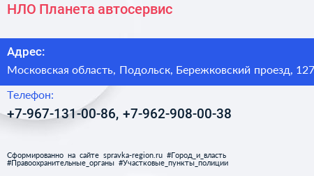 НЛО Планета, автосервис по адресу Московская область, Подольск, Бережковский проезд, 127 в дальнейшем Организация, размещена в следующих категориях: