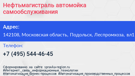 Нефтьмагистраль, автомойка самообслуживания по адресу 142108, Московская область, Подольск, Леспромхоза, вл1 в дальнейшем Организация, размещена в следующих категориях: