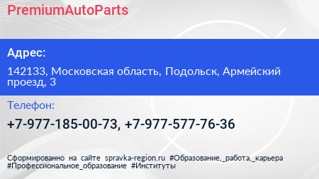 PremiumAutoParts по адресу 142133, Московская область, Подольск, Армейский проезд, 3 в дальнейшем Организация, размещена в следующих категориях: