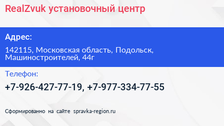 RealZvuk, установочный центр по адресу 142115, Московская область, Подольск, Машиностроителей, 44г в дальнейшем Организация, размещена в следующих категориях: