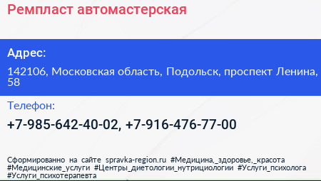 Ремпласт, автомастерская по адресу 142106, Московская область, Подольск, проспект Ленина, 58 в дальнейшем Организация, размещена в следующих категориях: