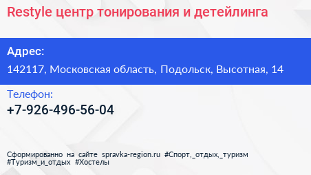 Restyle, центр тонирования и детейлинга по адресу 142117, Московская область, Подольск, Высотная, 14 в дальнейшем Организация, размещена в следующих категориях: