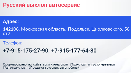 Русский выхлоп, автосервис по адресу 142108, Московская область, Подольск, Циолковского, 58 ст2 в дальнейшем Организация, размещена в следующих категориях:
