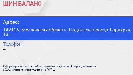 ШИН-БАЛАНС по адресу 142116, Московская область, Подольск, проезд Горпарка, 13 в дальнейшем Организация, размещена в следующих категориях: