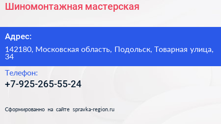 Шиномонтажная мастерская по адресу 142180, Московская область, Подольск, Товарная улица, 34 в дальнейшем Организация, размещена в следующих категориях: